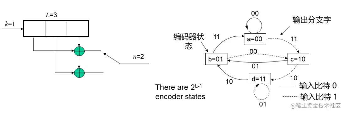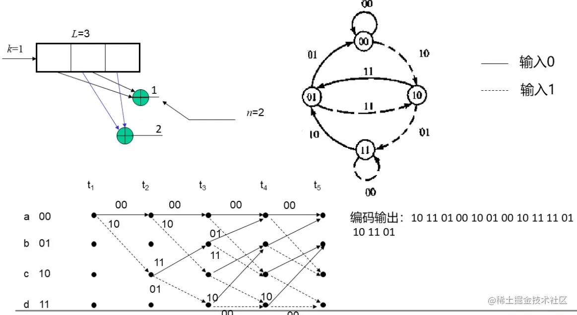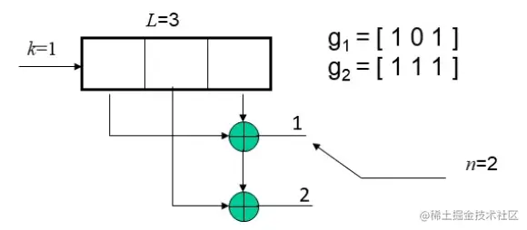 卷积码由三个整数描述, (n, k, L), 其中k/n也表示编码效率,L称为约束长度; 表示在编码移位寄存器中k元组的级数,k表示编码时一次输入编码器的码元数。