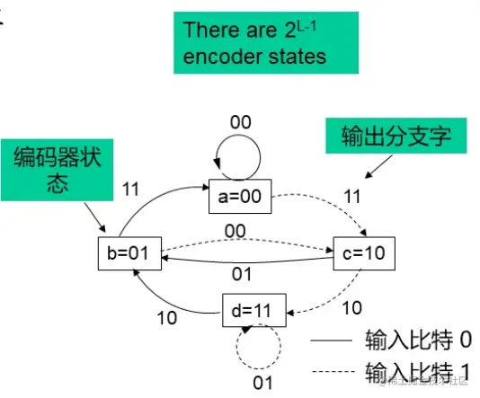 状态图方框内的状态表示寄存器最右端(L-1)级的可能内容,状态间的路径表示由此状态转移是的输出分支字。寄存器的状态表示为a=00,b=01,c=10,d=11.对应于两种可能的输入比特,从每一个状态出发只有两种转移,状态转移时的输出分支字标注在相应的转移路径旁。图中实线表示输入比特为0的路径,虚线表示输入比特为1的路径。