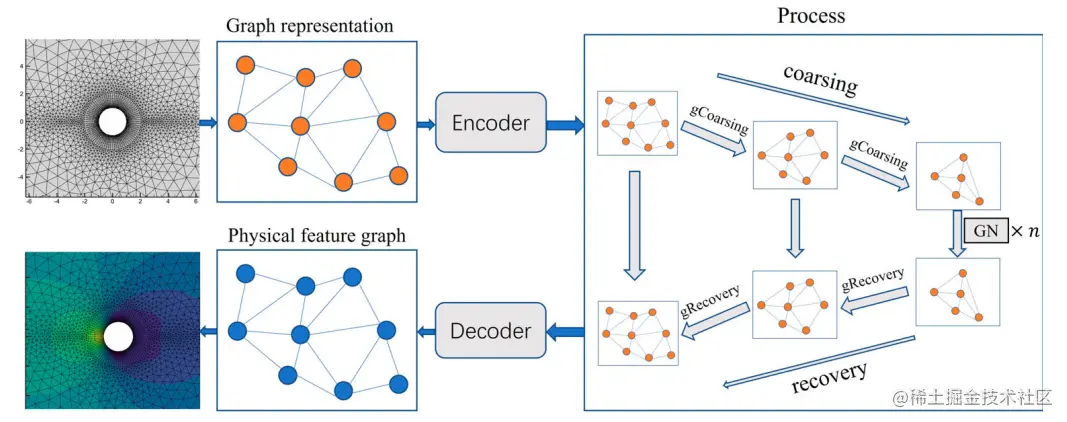 AMGNET 是一种基于图神经网络的 CFD 计算模型,该模型可以预测在不同物理参数下的流场。图3.1为模型的网络结构图,该模型的基本原理就是将网格结构转化为图结构,然后通过网格中节点的物理信息、位置信息以及节点类型对图中的节点和边进行编码。接着对得到的图神经网络使用基于代数多重网格算法( Olson and Schroder, 2018 )的粗化层进行粗化,将所有节点分类为粗节点集和细节点集,其中粗节点集是细节点集的子集。粗图的节点集合就是粗节点集,于是完成了图的粗化,缩小了图的规模。粗化完成后通过设计的图神经网络信息传递块( GN )来总结和提取图的特征。之后图恢复层采用反向操作,使用空间插值法( Qi et al.,2017 )对图进行上采样。例如要对节点i插值,则在粗图中找到距离节点i最近的k个节点,然后通过公式计算得到节点i的特征。最后,通过解码器得到每个节点的速度与压力信息。
