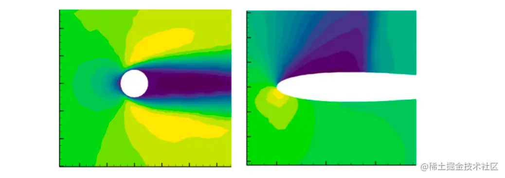 图4.3 原文中雷诺数=78的圆柱速度场的预测(左图);攻角=8.0,马赫数=0.65的机翼压力场的预测(右图)
