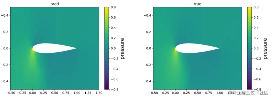 图4.2 攻角=8.0,马赫数=0.65下的机翼压力场的预测值与真实值对比图