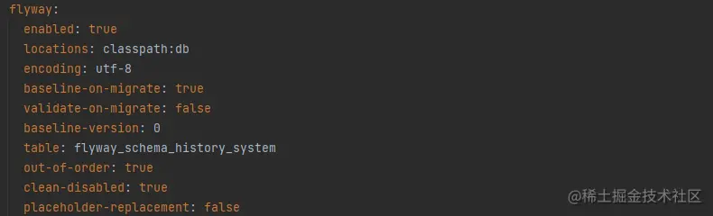然后在application.yml中对flyway进行配置,配置项路径spring-flyway: