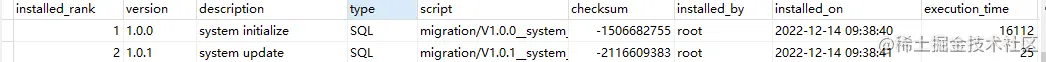 主要就是脚本文件位置(locations),数据库中的表名(table)等,数据库的相关配置如果不配置会自动引用配置文件中的datasource配置,其他具体配置项释义可参见本文后续。配置文件配置好后,启用项目flyway会自动创建记录执行情况的数据表: