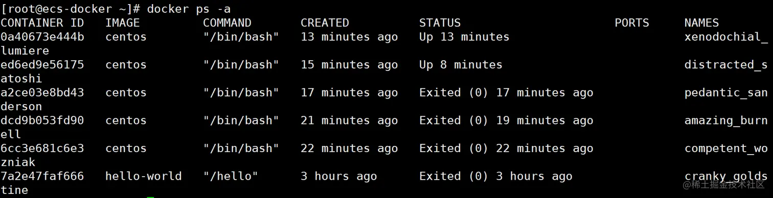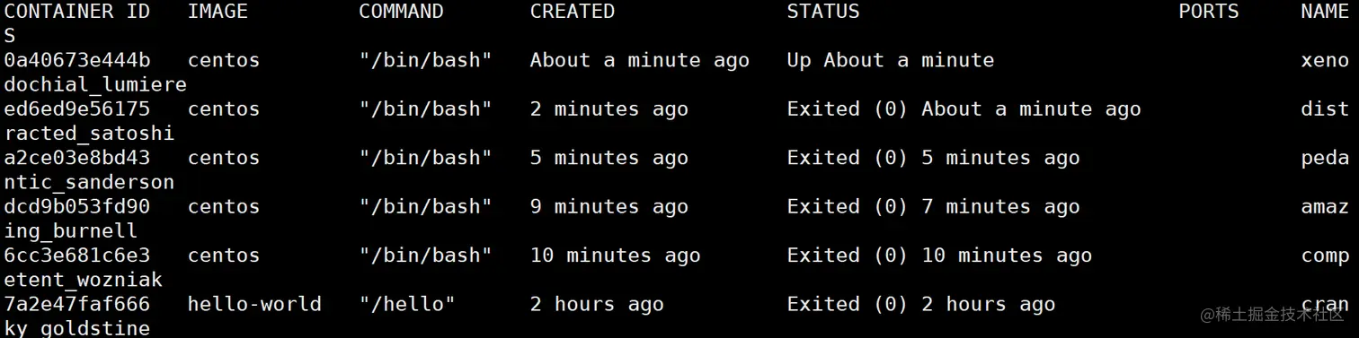 使用docker ps -a可以查看容器列表(所有容器,包括运行中和未运行的):