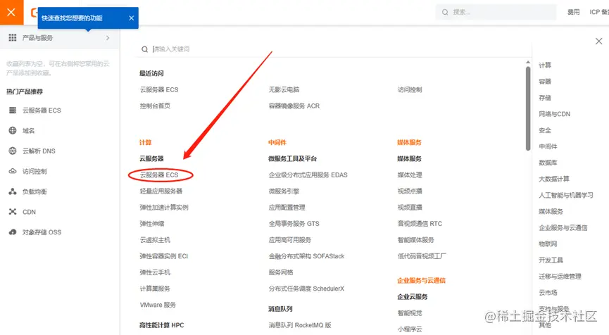 进入控制台后,点击作上角的 三 个横杠,选择计算专区中的云服务器ECS,如图: