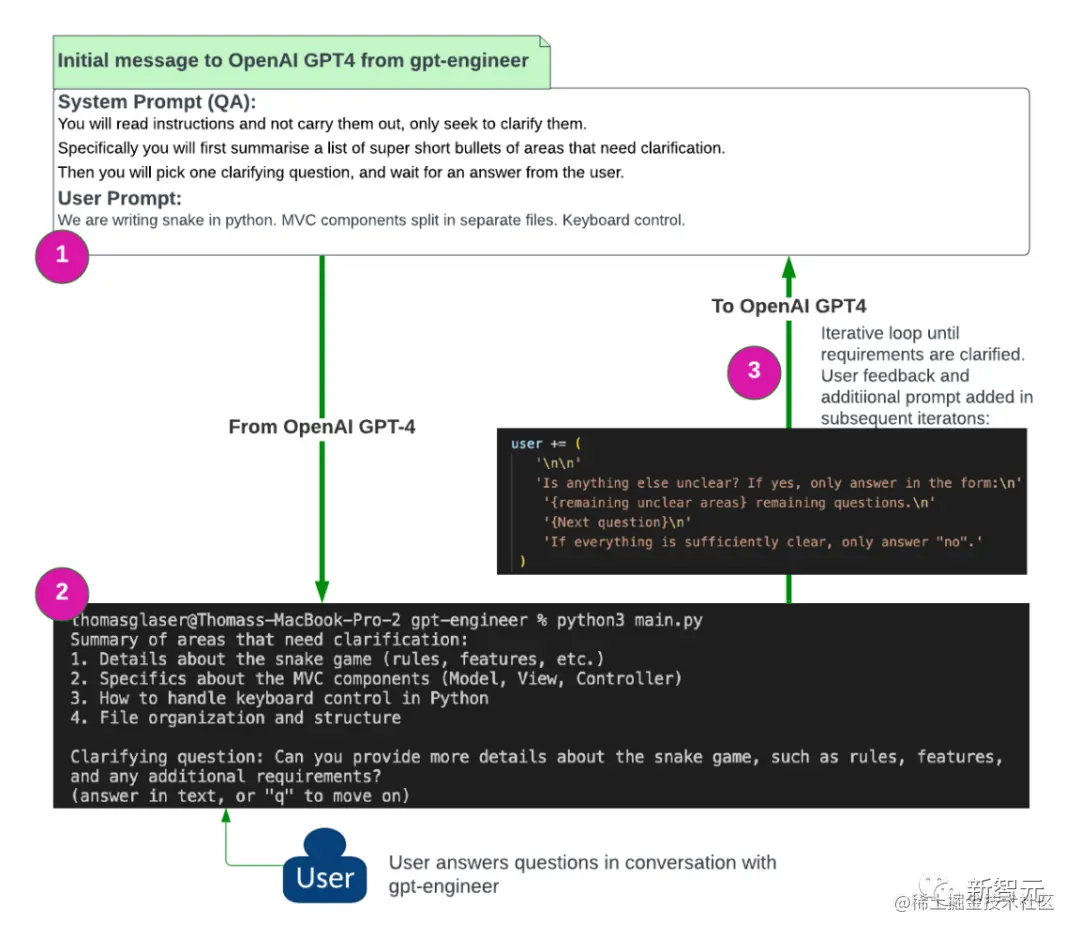 GPT-Engineer系统接收来自OpenAI GPT-4的反馈,了解哪些需求需要澄清,并回应提示用户澄清的问题。
