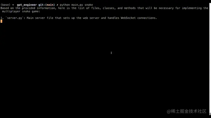 当你简单回答完这些问题后,GPT-Engineer就根据这些信息,给出了能够实现目标所需的文件、类和方法的列表。