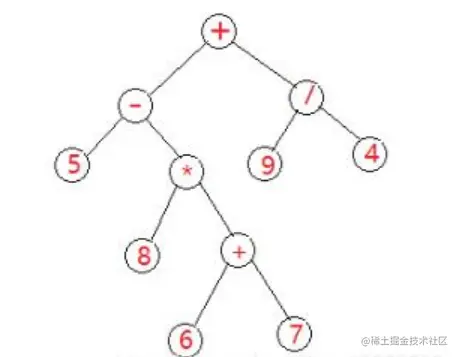 因此根据语法树可以得出他后序遍历(后缀表达式)为:5 8 6 7 + * - 9 4 / +