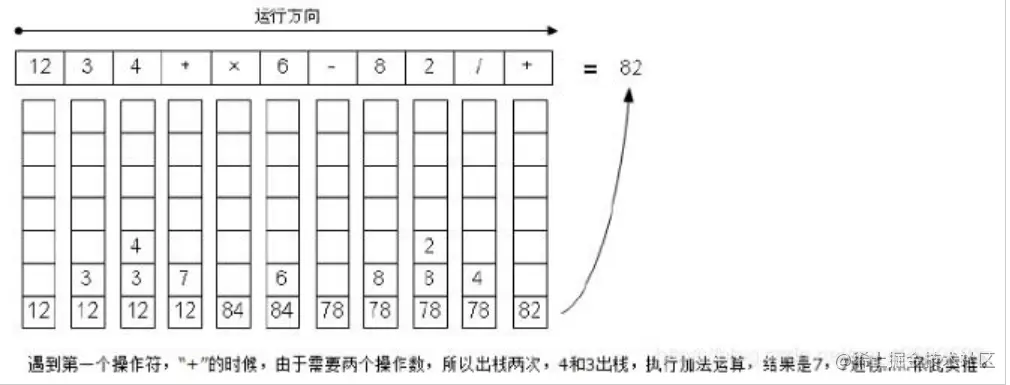 /*如果遇到操作运算符则,弹出两个数据进行运算,然后将得出的结果重新入栈*/