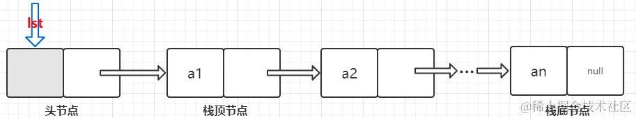 (2)链栈的初始化:需要声明一个头节点(相当于栈顶指针),将其指针域赋值为 null