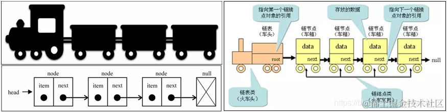 1.2、什么是链表:链表类似于火车,有一个火车头,火车头会连接一个节点,节点上有乘客,并且这个节点会连接下一个节点,以此类推,示意图如下: