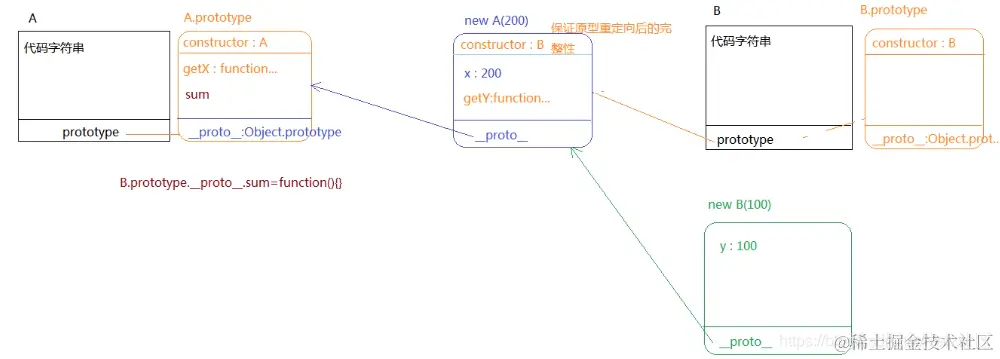 B.prototype.constructor = B; //修改子类的原型指向后,保证原型重定向的完整性