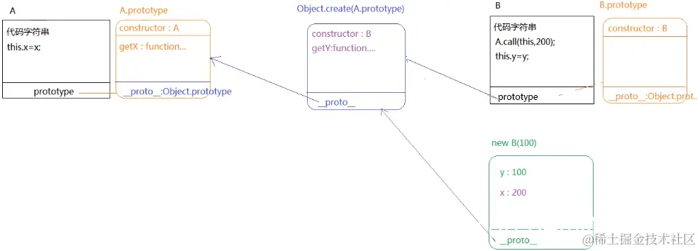 A.call(this,200); //改变this指向,A类中的this此时指向B类的实例b1:b1.x = 200