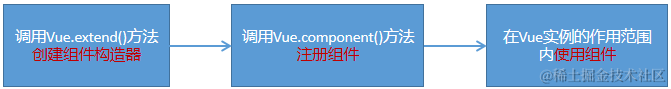 组件的使用分成三个步骤:(1)创建组件构造器、(2)注册组件、(3)使用组件、