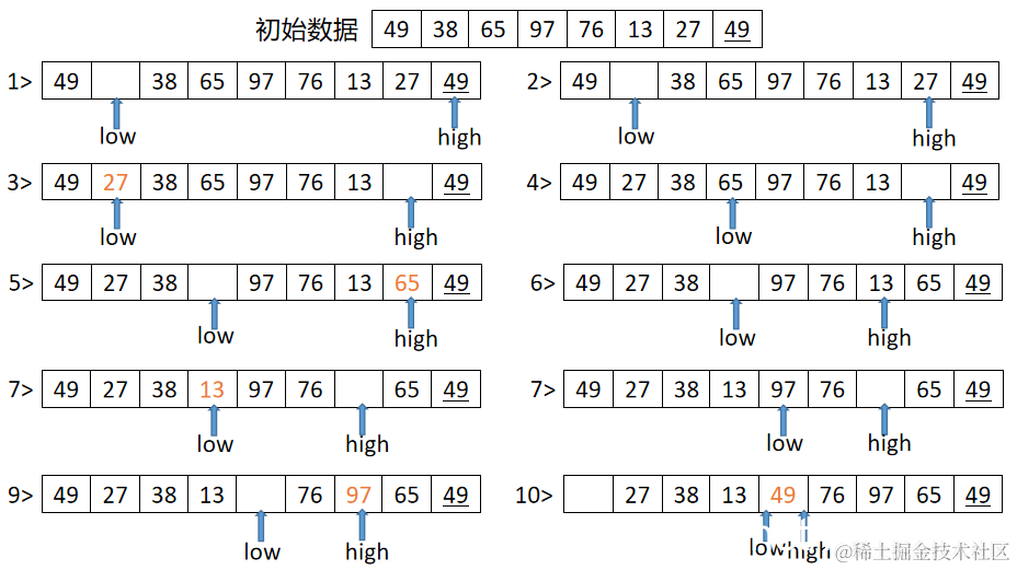 (2)执行流程:原始序列:{49,38,65,97,76,13,27,49}