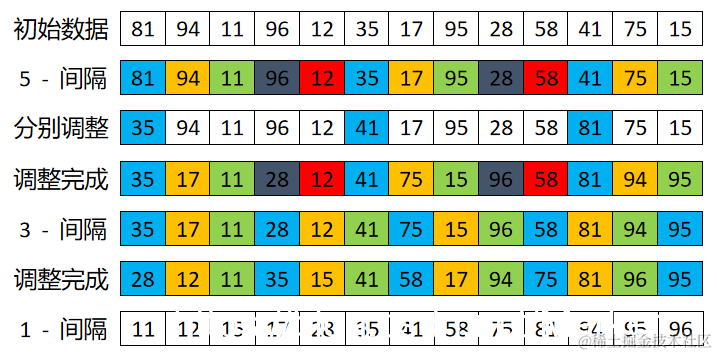 注意到增量5、2、1是逐渐缩小的,这就是缩小增量排序的由来。直接插入排序适合于序列基本有序的情况,希尔排序的每趟排序都会使整个序列变得更加有序,等整个序列基本有序了,再来一趟直接插入排序,这样会使排序效率更高,这就是希尔排序的思想。