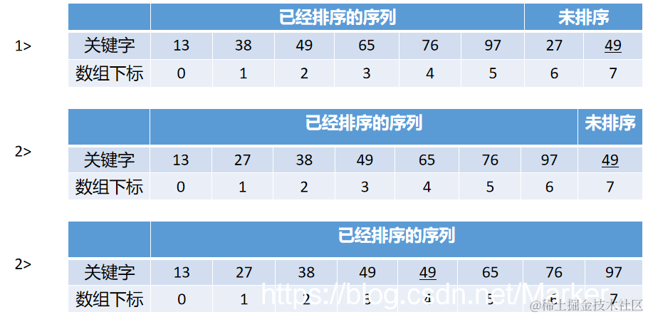 (1)执行流程:已经排序的序列{13,38,49,65,76,97} 、待排序列:{27,49}