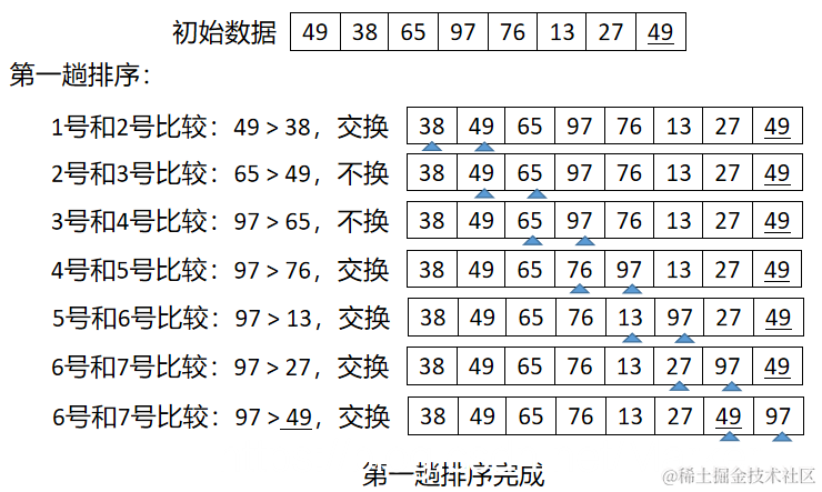 至此一趟冒泡排序结束,最大的 97 被交换到了最后,97 到达了它最后的位置。接下来对序列 38,49,65,76,13,27,49 按照同样的方法进行第二趟冒泡排序。经过若干趟冒泡排序后,最终序列有序。要注意的是,冒泡排序算法结束的条件是在一趟排序过程中没有发生关键字交换。