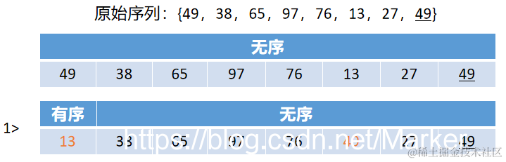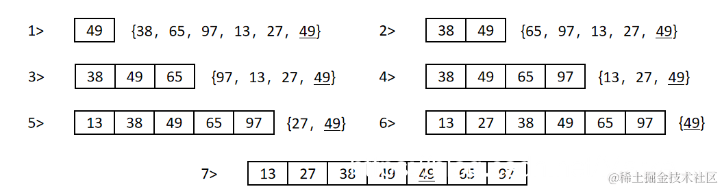 (1)执行流程:原始序列:{49,38,65,97,13,27,49}