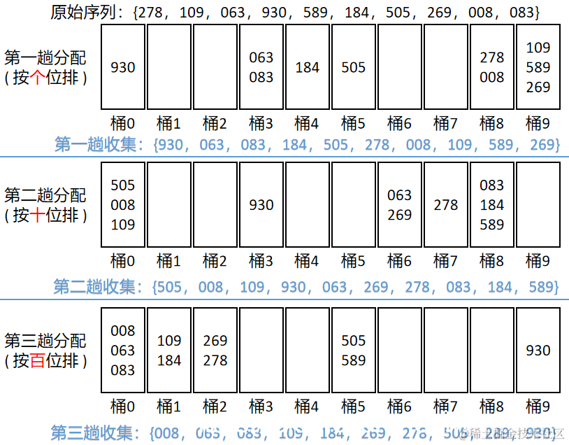 时间复杂度:平均和最坏情况下都是O(d(n+rd))。其中,n 为序列中的关键字数;d 为关键字的关键字位数,如930,由3位组成,d=3;rd 为关键字基的个数,这里的基指的是构成关键字的符号,如关键字为数值时,构成关键字的符号就是0~9这些数字,一共有十个,即rd=10。
