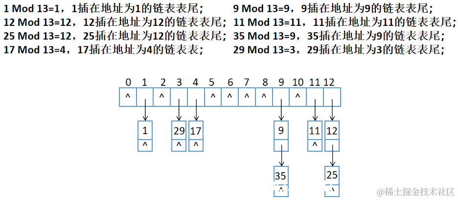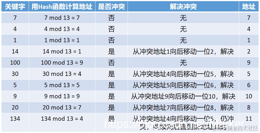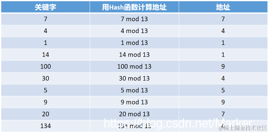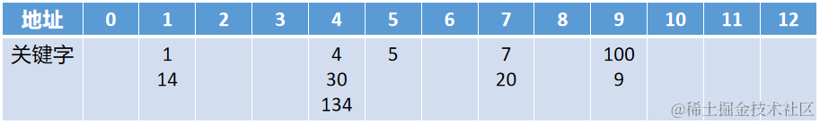 (2)例题:关键字序列为 {7,4,1,14,100,30,5,9,20,134} ,设 Hash 函数为 H(key) = key Mod 13,建立表长为 13 Hash表。求解过程如下: