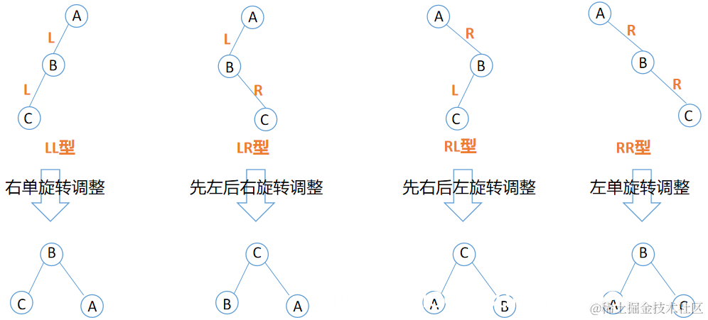 (4)平衡调整必须保持排序二叉树左小右大的性质,平衡调整有4种情况,分别为LL型、RR型、LR型和RL型。平衡调整的四种类型如下:调整原则:降低高度、保持二叉排序树的性质
