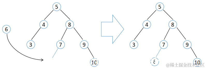 二叉排序树是一个查找表,插入一个关键字首先要找到插入位置。对于一个不存在于二叉排序树中的关键字,其查找不成功的位置即为该关键字的插入位置,如图所示。