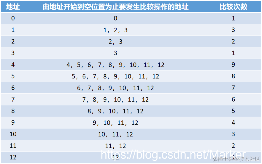 其中,n 是查找表中记录的个数;pi 是查找第 i 个记录的概率,一般取 1/n; ci 是找到第 i 个记录所需要进行比较的次数,即查找长度。