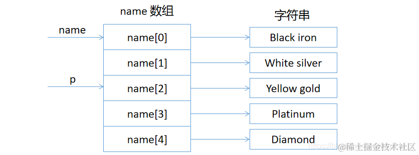 例如下图中,name是一个指针数组,它的每一个元素都是一个指针型的变量,其值为地址。name 既然是一个数组,那么它的每一个元素都由相应的地址。数组名 name 代表该指针数组首元素的位置。 name + i 是 name[i] 的地址,name + i 就是指向指针型数据的指针。还可以设置一个指针变量 p,它指向指针数组的元素。