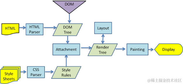 浏览器在显示页面之前是一个边解析边渲染的过程,首先浏览器解析 HTML 文档构成 DOM 树,然后解析 CSS 文件构建 CSSOM 树,然后将 DOM 树和 CSSOM 树合并成一棵渲染树(这里主要做的是排除非视觉节点,比如 script,meta 标签和排除 display 为 none 的节点,之后进行渲染步骤)。