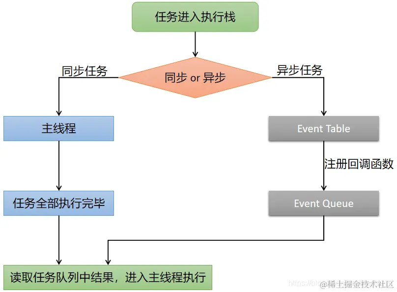 (3)一旦"执行栈"中的所有同步任务执行完毕,系统就会读取"任务队列"里已经完成操作的异步任务,并将其执行。