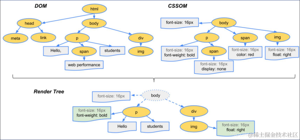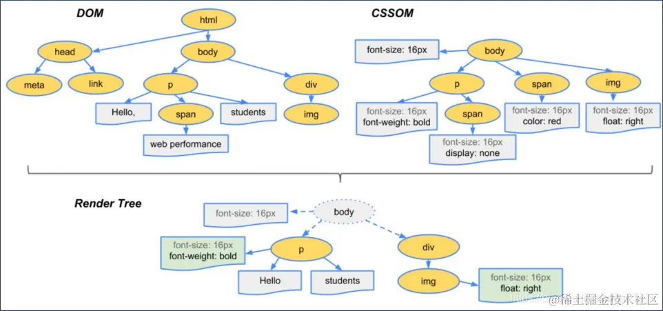 浏览器在渲染页面前,会首先解析 HTML 和 CSS 代码,根据代码构建相应的 HTML 树(DOM) 和 CSS 树(CSSOM),然后将两棵树合并称为一棵 渲染树(render tree)(这里主要做的是排除非视觉节点,比如 script,meta 标签和排除 display 为 none 的节点,之后进行渲染步骤)。过程如下图所示: