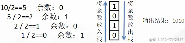 (1)主要原理:如何实现十进制转二进制?要把十进制转化成二进制,可以将该十进制数字和2整除(二进制是满二进一),直到结果是0为止。将每一步的余数进栈,最后将栈中的内容其输出,输出的结果就是该十进制数对应的二进制数了。比如将一个十进制数 10,转化成对应的二进制数,其过程大概如下所示: