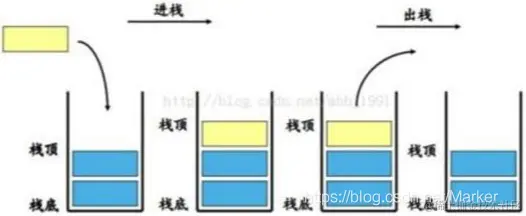 栈(stack),它是一种受限的线性表,后进先出(LIFO — last in first out)。栈结构仅允许在表的一端进行插入和删除运算,这一端被称为栈顶,相对地,把另一端称为栈底。 LIFO(last in first out)表示就是后进入的元素,第一个弹出栈空间,类似于自动餐托盘,最后放上的托盘,往往先把拿出去使用。向一个栈插入新元素又称作进栈、入栈或压栈,它是把新元素放到栈顶元素的上面,使之成为新的栈顶元素;从一个栈删除元素又称作出栈或退栈,它是把栈顶元素删除掉,使其相邻的元素成为新的栈顶元素。示意图如下: