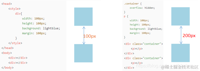 从效果上看,因为两个 div 元素都处于同一个 BFC 容器下 (这里指 body 元素) 所以第一个 div 的下边距和第二个 div 的上边距发生了重叠,所以两个盒子之间距离只有 100px,而不是 200px。可设置元素的 display 属性为 inline-block 消除这种现象。