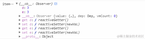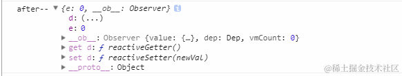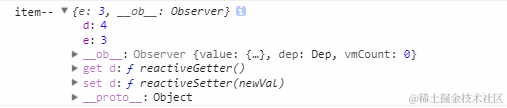 可以看出 d 属性是有 get 和 set 方法的,而新增的 e 属性是没有的,这个 e 就是 data 新增的属性,Vue 是不会监听它的。