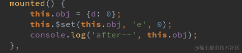 Vue.set(vm.obj, 'e', 0); //你还可以使用 vm.$set 实例方法,这也是全局 Vue.set 方法的别名: