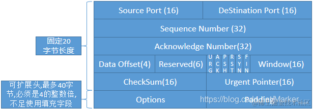 TCP(Transmission Control Protocol,传输控制协议):TCP 在传输数据之前必须先建立一个连接。TCP 做了很多工作来提供可靠的数据传输,包括建立、管理和终止连接,确认和重传。同时 TCP 还提供分段和重组,流量控制(Flow Control)等。下面看一下TCP 的头部报文结构: