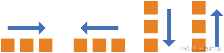 将父元素设置 flex 布局后,其 flex items 默认都是沿着 main axis(主轴)从 main start 开始往 main end 方向排布,flex-direction 属性决定了 main axis 的方向,有下面 4 个取值: