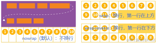 | nowrap(默认):flex items单行显示 | wrap:flex items多行显示 | wrap-reverse:多行(对比wrap,cross start与cross end相反) |