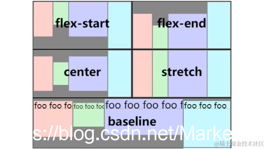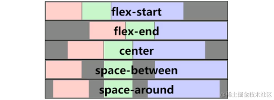 | flex-start(默认值):与 main start 对齐 | flex-end:与main end对齐 | center:居中对齐 |