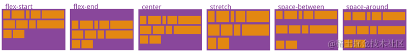 将父元素设置 flex 布局后,align-content 属性决定了多行 flex items 在 cross axis 上的对齐方式,用法与 justify-content 类似,有下面几个取值: