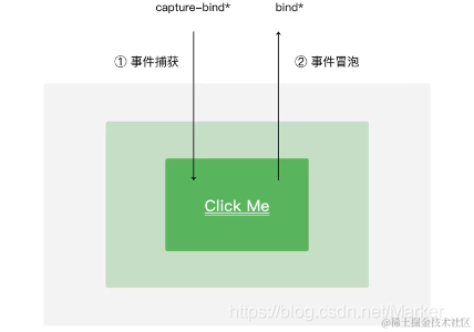 <!--bind:一层层传递,从view3->view2->view1进行捕获,再view1->view2->view3进行冒泡-->