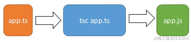 Typescript 文件的后缀名以 . ts 为结尾,浏览器没法直接解析 . ts 文件(浏览器也无法直接解析 ES6 的代码),如果要使用 Typescript 开发项目,就需要将 Typescript 转化成浏览器能直接解析的 JavaScript 代码,比如要转化使用 TypeScript 编写的 app.ts 文件,通过命令 tsc app .ts 可以将 Typescript 转化成浏览器能直接解析的 JavaScript 代码。TypeScript 转换为 JavaScript 过程如下图: