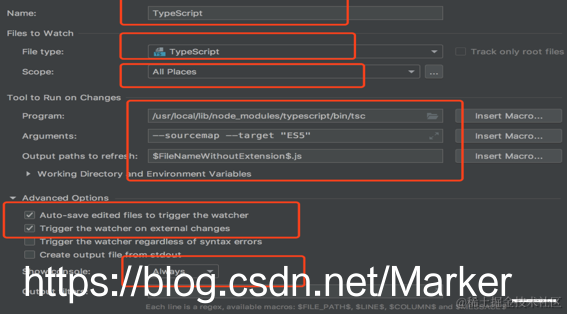 3.4、WebStorm 配置:WebStorm 是提供了创建 TypeScript 的模版文件,但是不提供自动编译 ts 文件为 js 和 map 文件,这里需要手动配置一下:File → Settings → Tools → File Watchers → + → <custom> ,配置内容如下: