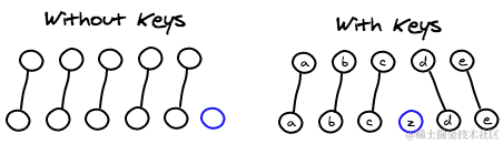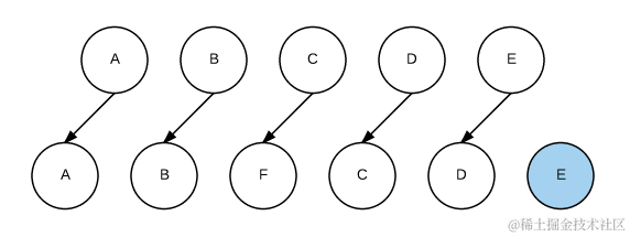 当某一层有很多相同的节点时,也就是列表节点时,Diff 算法的更新过程默认情况下也是遵循以上原则。比如下面这种情况,我们希望可以在 B 和 C 之间加一个 F,Diff 算法默认执行起来是这样的: