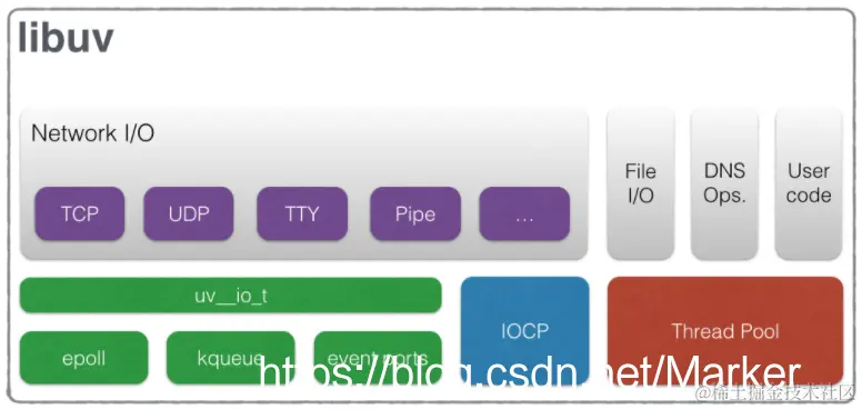 Node.js 最早时是使用了 Google 的 V8 解析引擎 和 Marc Lehmann 的 libev。Node.js 将事件驱动的 I/O 模型与适合该模型的编程语言(JavaScript)融合在了一起,但随着 Node.js 的日益流行,Node.js 也需要同时支持 Windows,但是 libev 只能在 Unix 环境下运行,而在 Windows 系统平台上与 kqueue(FreeBSD) 或者 (e)poll(Linux) 等内核事件通知相应的机制是 IOCP。