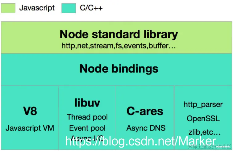 Node Bindings 是沟通 JS 和 C++ 的桥梁,封装 V8 引擎 和 Libuv 的细节,向上层提供基础 API 服务。