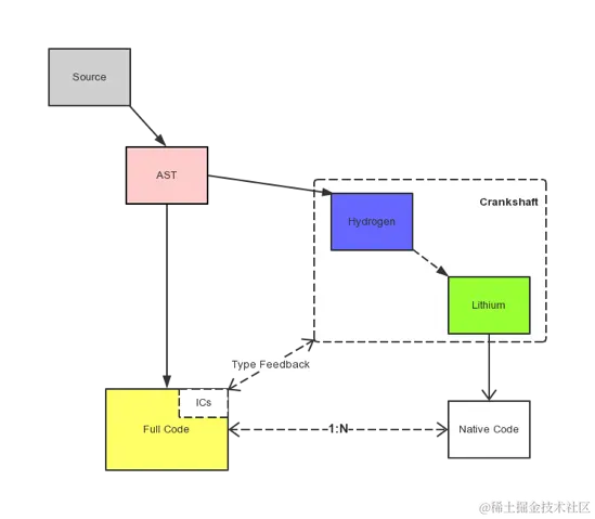 V8 更加直接的将抽象语法树通过 JIT 技术转换成本地代码,放弃了在字节码阶段可以进行的一些性能优化,但保证了执行速度。 在 V8 生成本地代码后,也会通过 Profiler 采集一些信息,来优化本地代码。虽然,少了生成字节码这一阶段的性能优化, 但极大减少了转换时间。