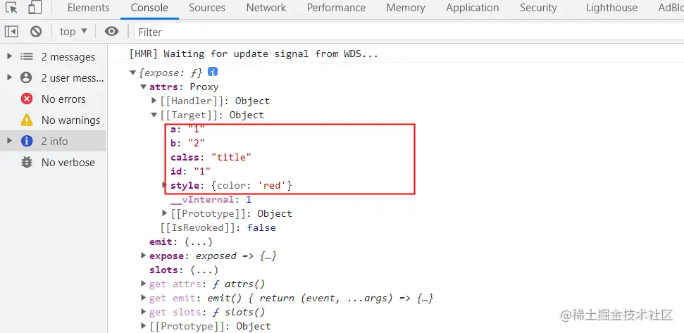 会惊奇的发现,这些属性都包含在attrs中!可见,h函数的第二个参数,可以给子组件传props值。